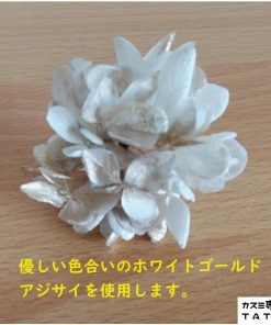 【材料】上質な花材料のみ使用。ドライフラワー/プリザーブドフラワー(カスミソウ/かすみ草、アジサイ)、和玉、水引、金箔シート、金属パール等。すぐにお使いいただけるようすべてのお花にIピン付。