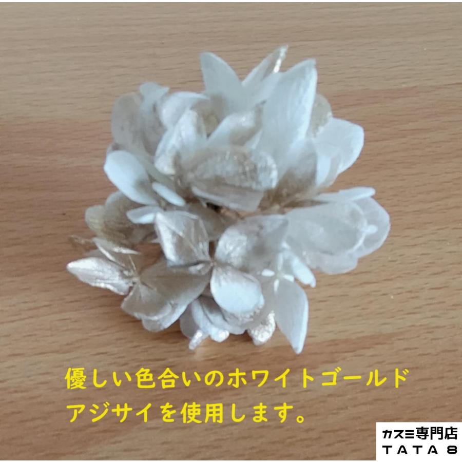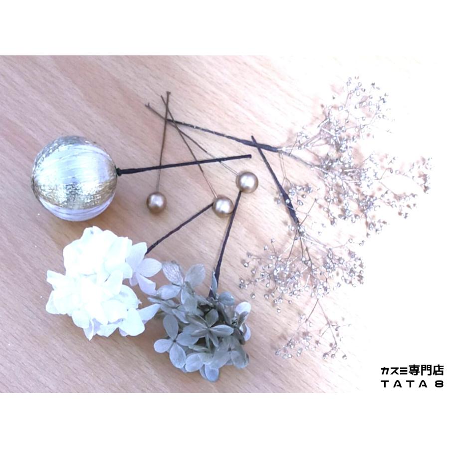 【材料】上質な花材料のみ使用。ドライフラワー/プリザーブドフラワー(カスミソウ/かすみ草、アジサイ)、和玉、水引、金箔シート、金属パール等。すぐにお使いいただけるようすべてのお花にIピン付。