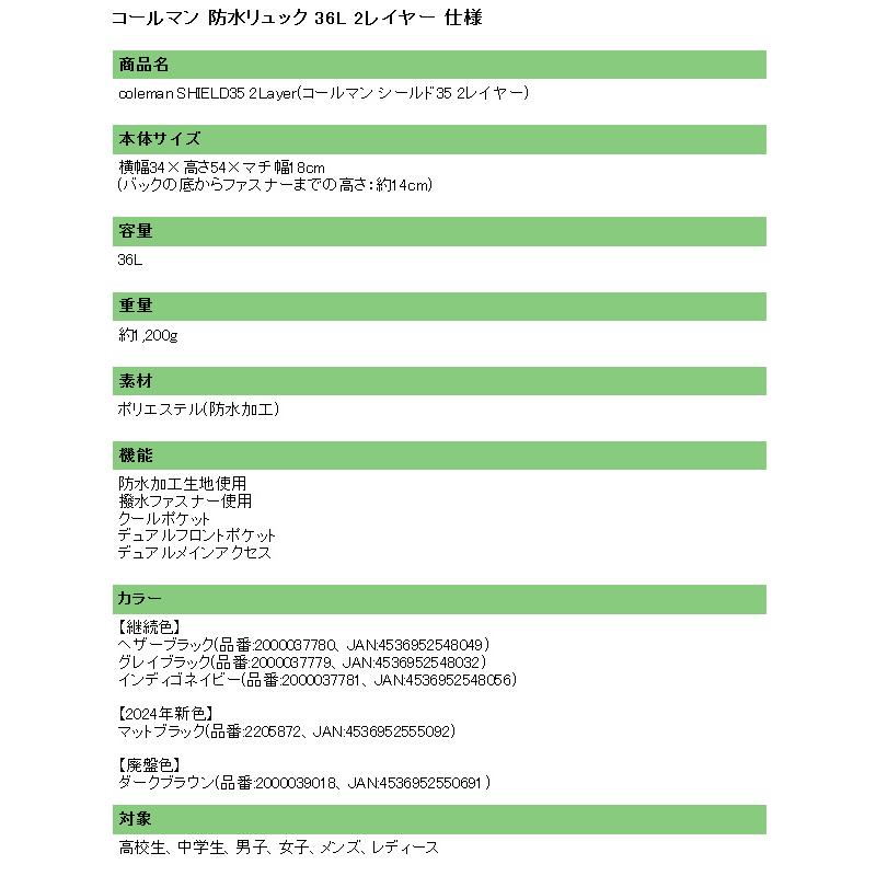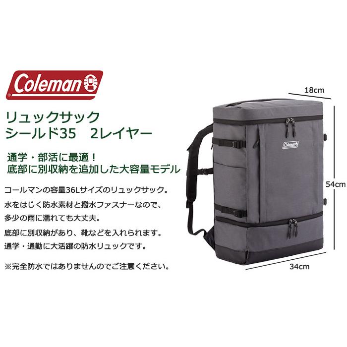 Coleman コールマン シールド35 2レイヤー 2層式スクエア型リュックサック 防水 大容量 リュック 通学 高校生 中学生