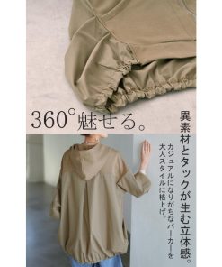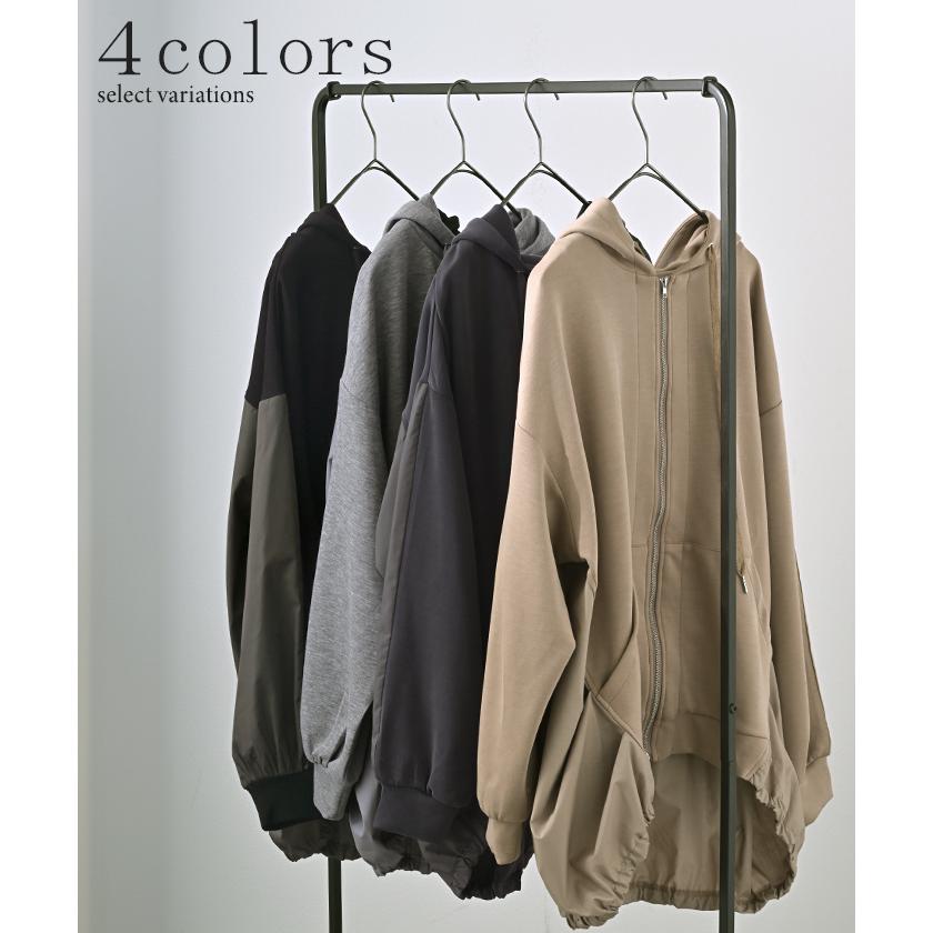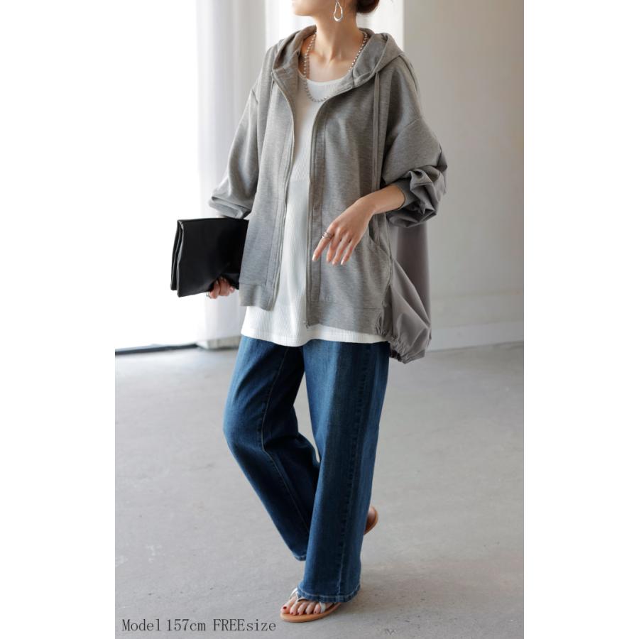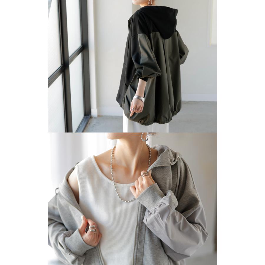 HUG.U パーカー ポンチ シャツ スポーティー アウター レディース チュニック 異素材 ライトアウター トップス ジップアップ フード フーディー ビッグ ゆったり