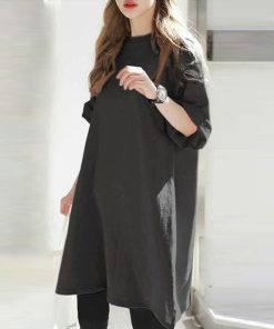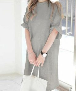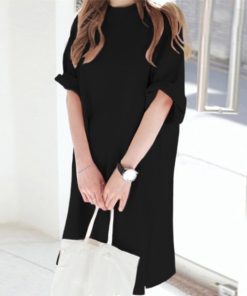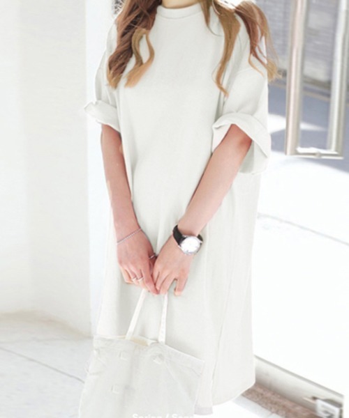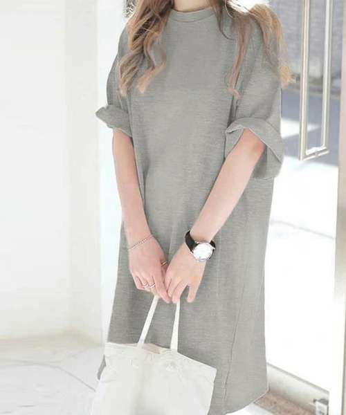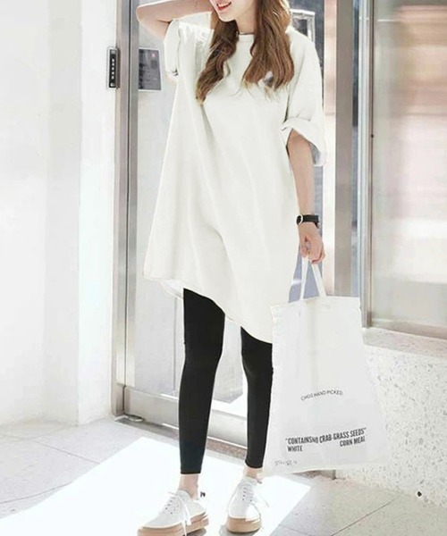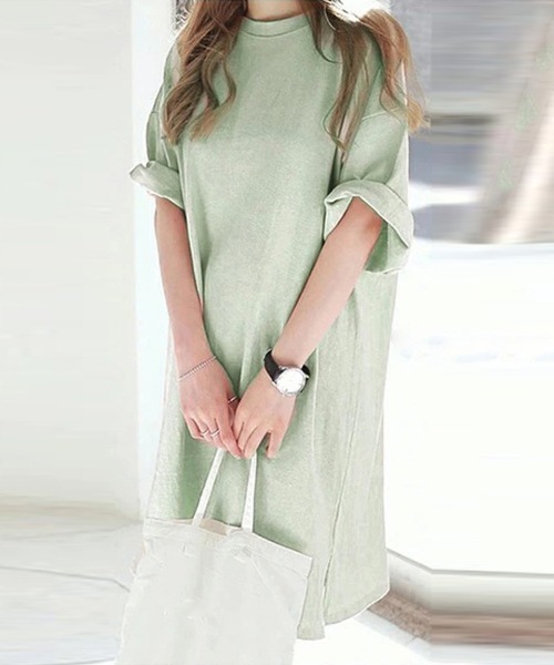 キーワード:tシャツ レディース クルーネック ロング丈 半袖 無地